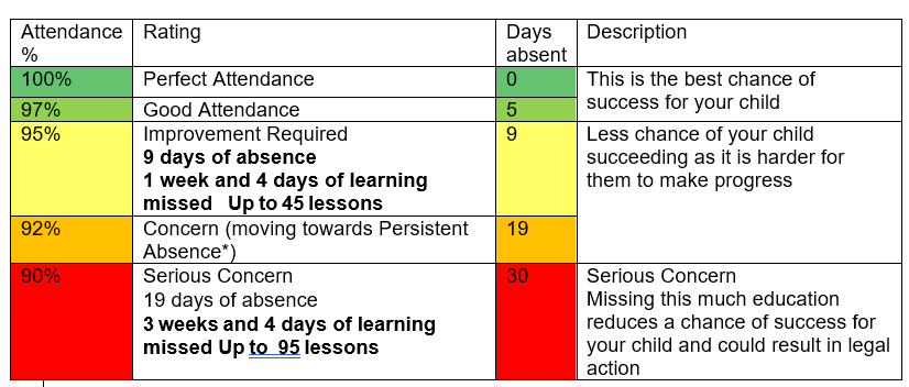 If a school can improve attendance by 1%, they will see a 5-6% improvement in attainment. Please help us and your child by ensuring his/her attendance remains at 100%, allowing him/her to achieve their potential.