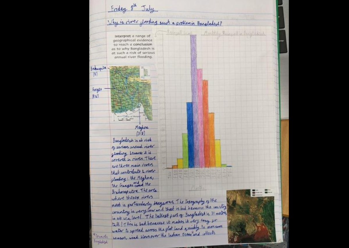 In Geography we learnt about flooding in Bangladesh as a result of climate change and poor infrastructure. We studied how this affected the people living in the flooded areas and how it impacted their lives.